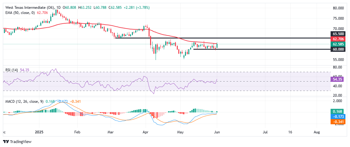 At the time of writing, WTI is trading near $62.60, up over 2.5% on the day, after rising as much as 4% during the early part of Monday’s session. Despite the strong intraday rally, prices remain capped just below the 50-day Exponential Moving Average (EMA) at $62.70 — a key resistance zone that has limited upside attempts since mid-May.