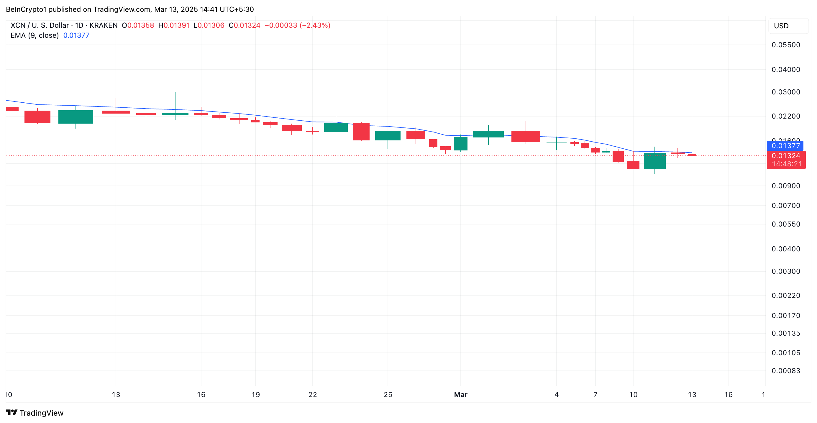 Readings from the XCN/USD one-day chart show the altcoin trading below its 20-day exponential moving average (EMA). This forms resistance above its price at $0.0137.