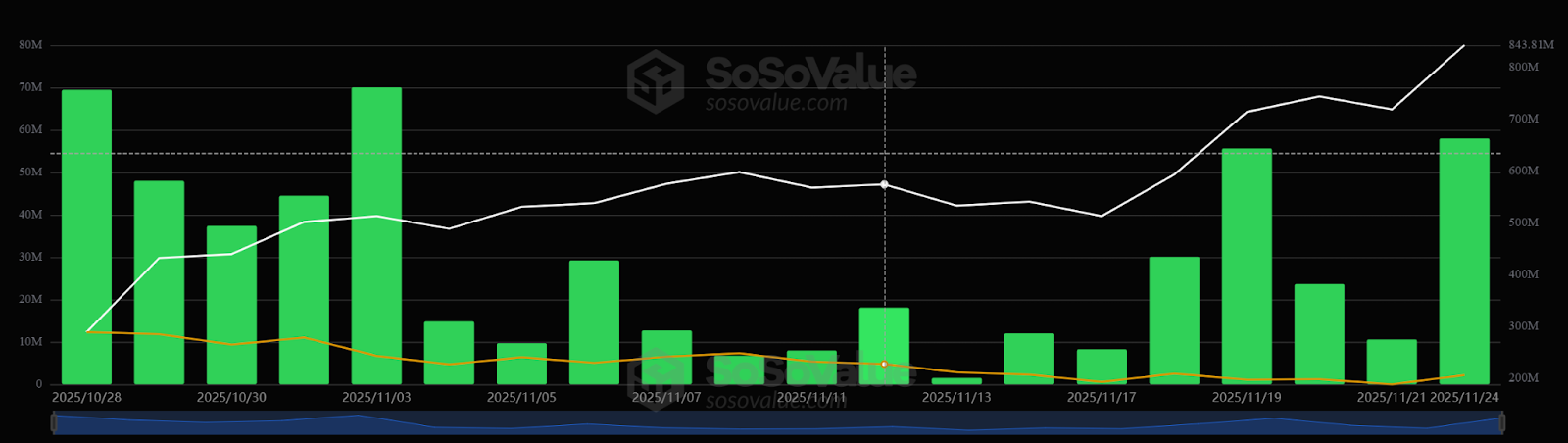 - Monday’s SOL ETF net additions reached US$58 million, the third strongest day, with Bitwise’s BSOL accounting for the majority at US$39.5 million.