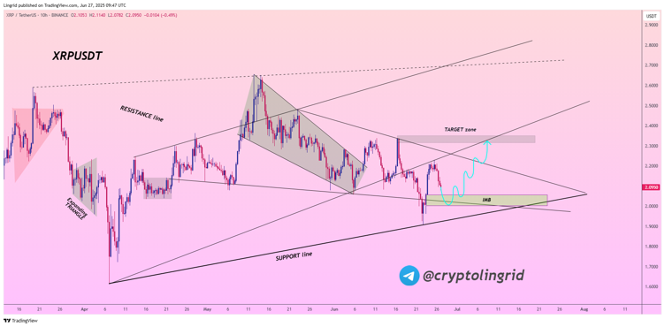 She added, “XRP dropped into the IMB zone and quickly bounced, defending the key support level between 2.00 and 2.05. The chart shows a potential accumulation structure forming after a falling wedge breakout, with the price beginning to coil toward a higher low.”