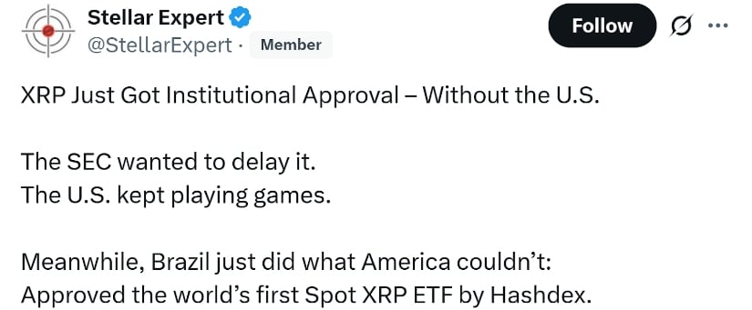 Brazil has approved the world’s first spot XRP ETF by Hashdex, achieving what U.S. regulators have delayed. Source: Stellar Expert via X