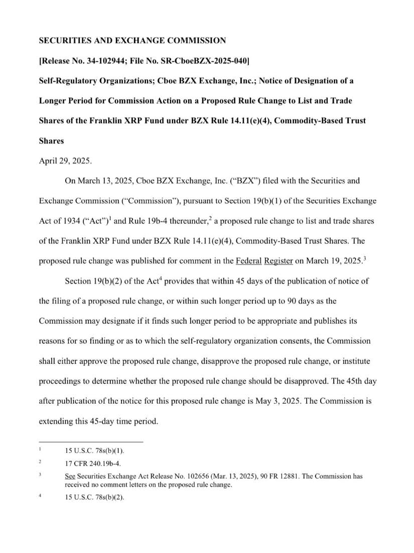 Franklin Templeton, a financial heavyweight managing over $1.5 trillion in assets, submitted the XRP ETF application on March 13, with the proposal published in the Federal Register on March 19. The SEC was initially expected to respond by May 3, but cited the need for more time to consider the proposed rule change and the issues it raises.