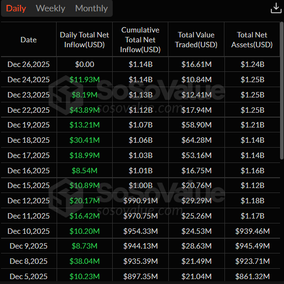 Recent inflows of $8.19 million pushed total ETF-held assets to around $1.2 billion over the Christmas period, showing the market that institutional investors are slowly building exposure through regulated products while retail sleeps.