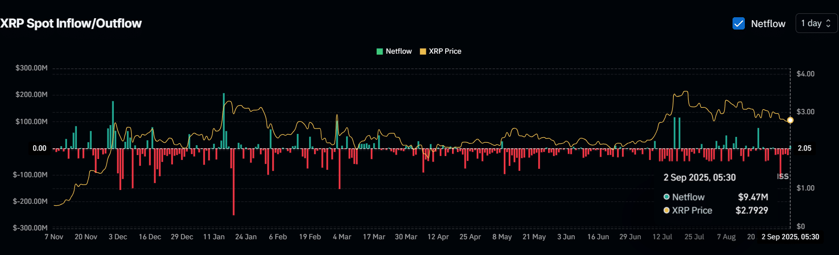 According to CoinGlass data, nearly $10 million worth of XRP tokens have been moved onto exchanges in the past 24 hours, hinting at potential dumping by holders after the modest price recovery.