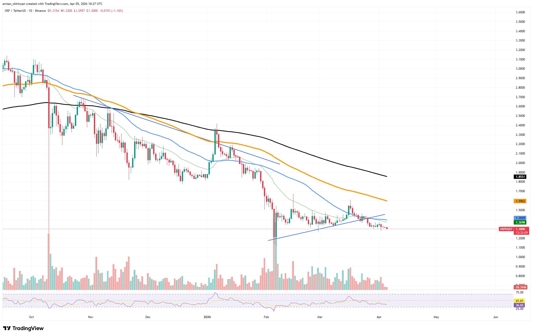 The best way to characterize XRP’s current trading situation is exhaustion. After a decline, price action has tightened into a range around the $1.30 mark, with lower highs and steady rejection from falling moving averages. In addition to the stagnation, we get volumes closer to zero and almost non-existent volatility.