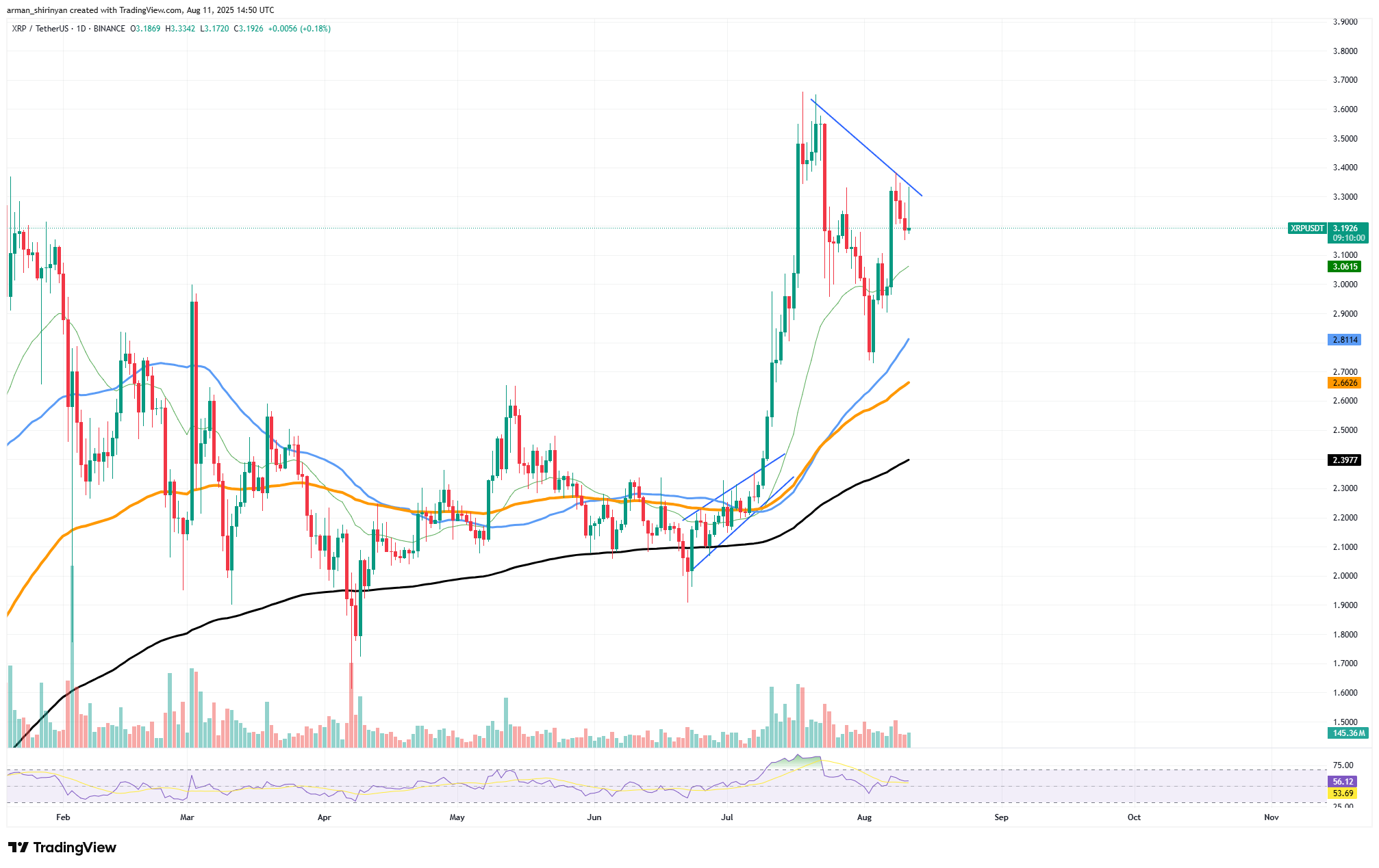 XRP may swiftly retest the $3.40-$3.50 range if it is able to break through the descending trendline. Failure to break out though could result in a retest of lower supports at $3.06 or even $2.82.