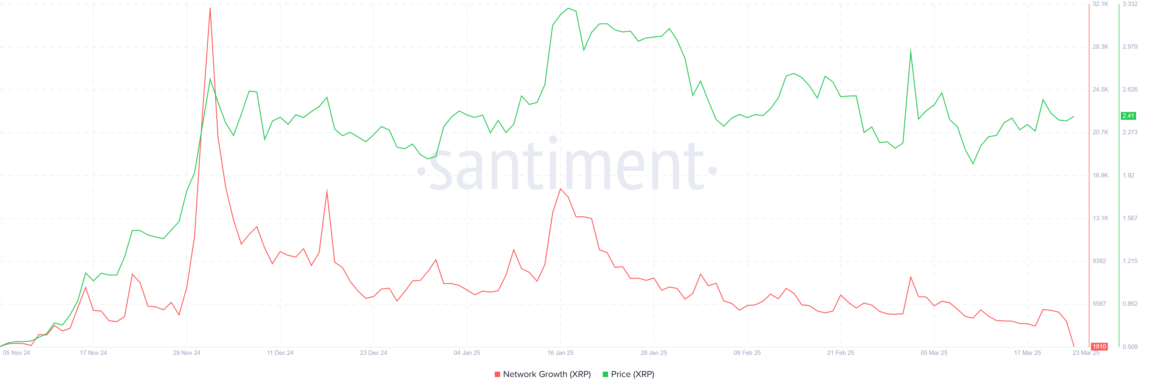 XRP’s macro momentum is also showing signs of strain. The network’s growth is currently at a four-month low, reflecting a decline in the rate at which new addresses are created.