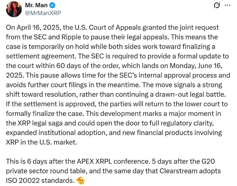 On April 16, 2025, the SEC and Ripple agreed to pause their legal battle, signaling a potential settlement and a major step toward regulatory clarity for XRP. Source: Mr. Man via X