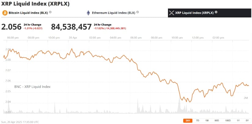 XRP is trading at around $2.05, down 1.31% in the last 24 hours at press time. Source: XRP Liquid Index (XRPLX) via Brave New Coin
