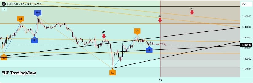 After facing three consecutive days of losses, XRP is now consolidating between $2.03 and $2.12. Market analysts say this range-bound behavior suggests an imminent move, but the direction remains uncertain.