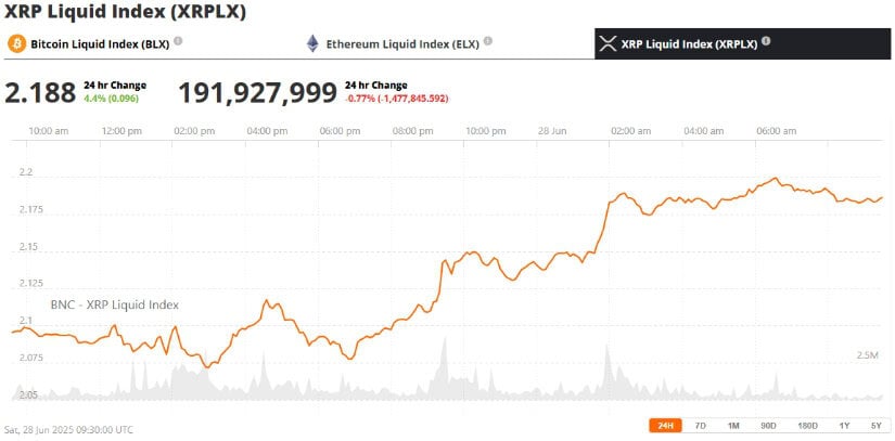 XRP was trading at around $2.18, up 4.4% in the last 24 hours at press time. Source: XRP Liquid Index (XRPLX) via Brave New Coin