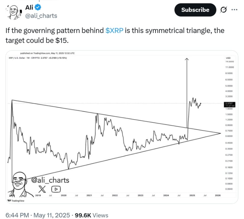 If XRP’s price breakout follows the symmetrical triangle pattern, it could target $15. Source: Ali Martinez via X