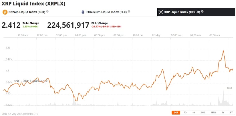 XRP was trading at around $2.41, up 2.33% in the last 24 hours at press time. Source: XRP Liquid Index (XRPLX) via Brave New Coin