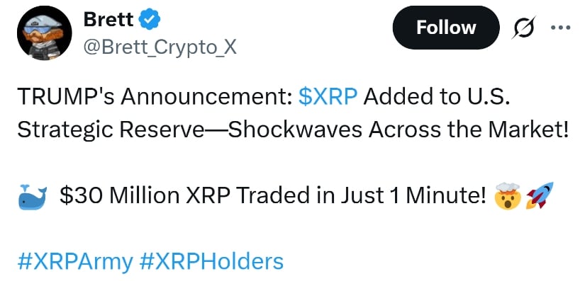 Trump’s announcement adding XRP to the U.S. strategic reserve sends shockwaves through the crypto market. Source: Brett via X
