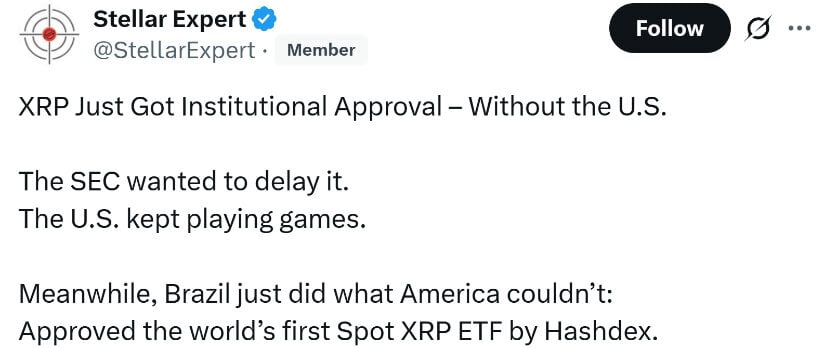 While the U.S. stalled, Brazil approved the world’s first Spot XRP ETF by Hashdex, giving XRP its first major institutional breakthrough. Source: Stellar Expert via X