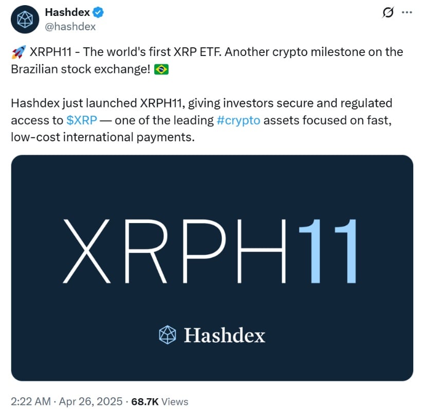 Brazil’s B3 exchange just made history with XRPH11, the world’s first XRP ETF launched by Hashdex. Source: Hashdex via X