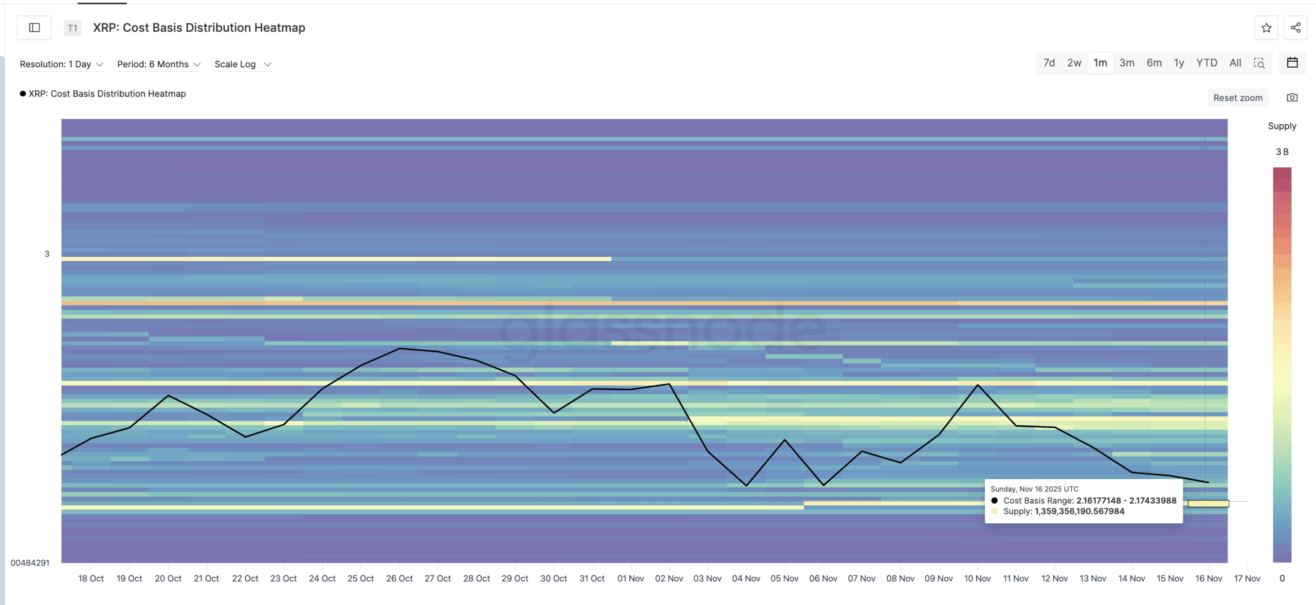 Even with that weakness, the $2.154 zone still holds. This is not just a chart level. The cost-basis heatmap confirms it. Between $2.161 and $2.174, XRP has a huge supply cluster of 1.359 billion tokens.