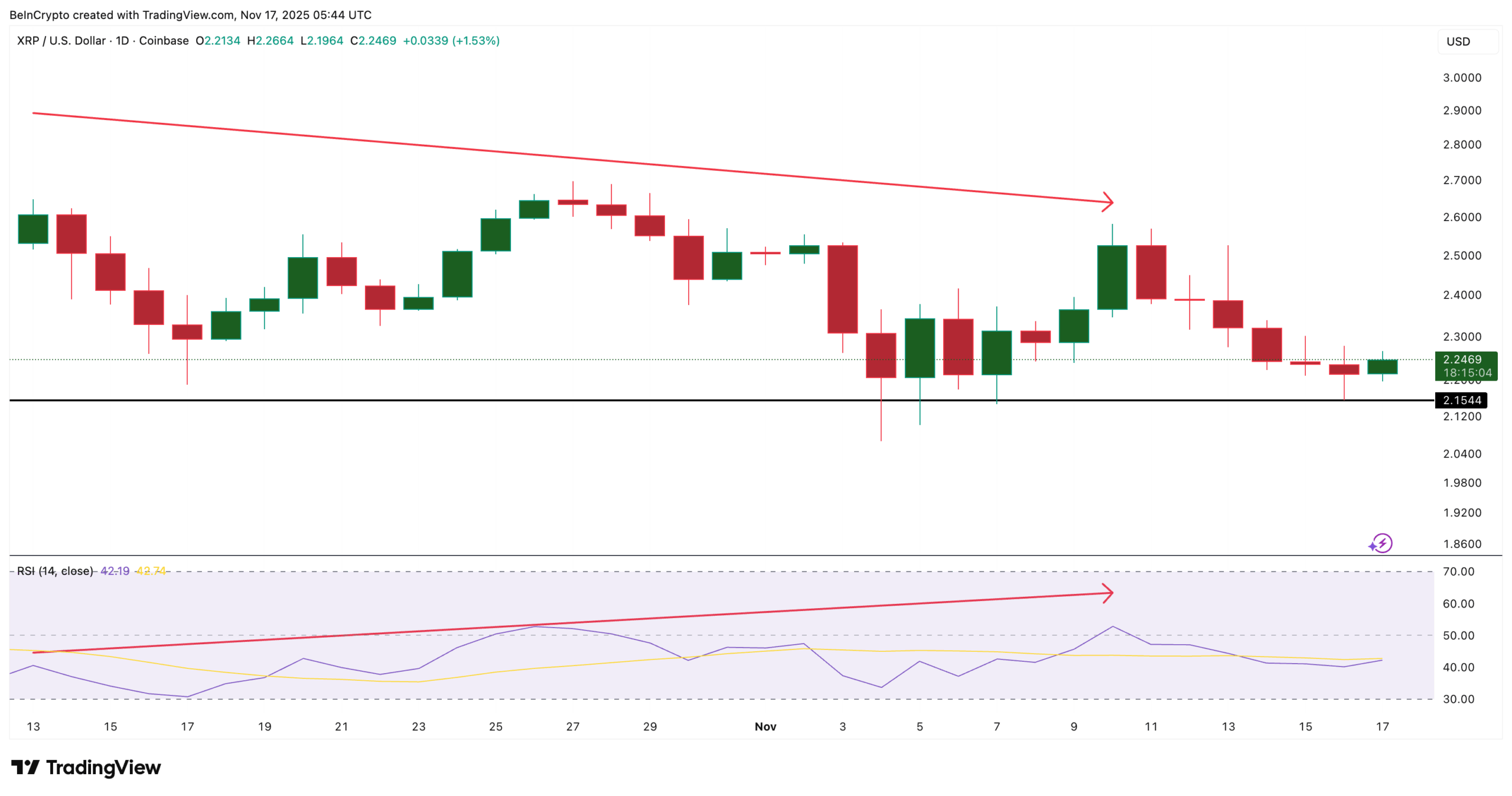 The first sign of pressure comes from momentum. Between October 13 and November 10, the XRP price made a lower high while the Relative Strength Index (RSI) made a higher high. RSI tracks buying pressure, and this pattern is called a hidden bearish divergence. It shows buying strength was rising, but not enough to push the price up.