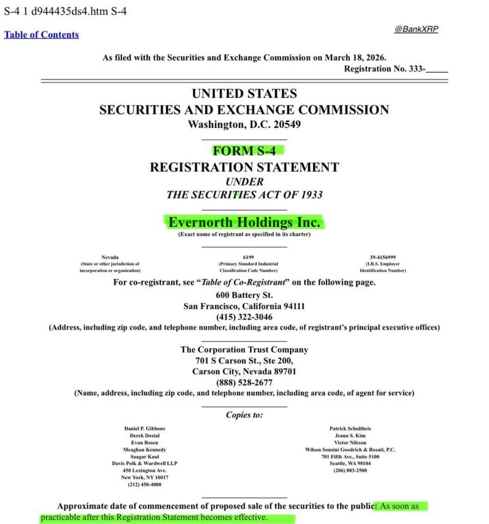 Evernorth Holdings Inc. has publicly filed its Form S-4 with the SEC on March 18, 2026, advancing its $1B+ XRP treasury plan toward a Nasdaq listing under XRPN. Source: @BankXRP via X