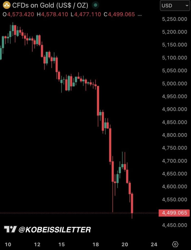 Gold prices fall below $4,500/oz for the first time since February 2nd. Gold is now down -$1,100/oz from its record high seen in January, Source: X