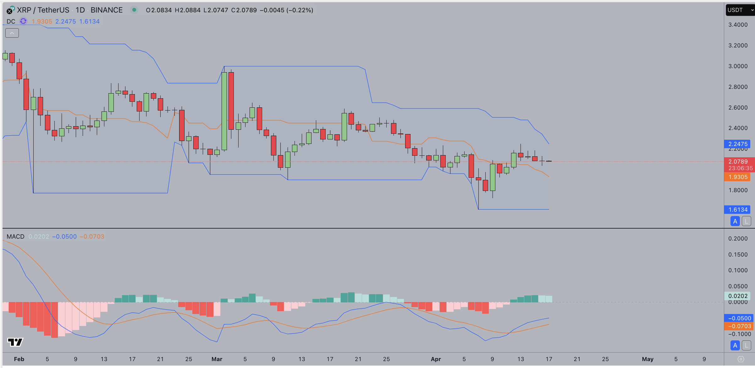 A MACD bullish crossover and price stability above the Donchian midline suggest positive momentum and a possible move toward $2.25.