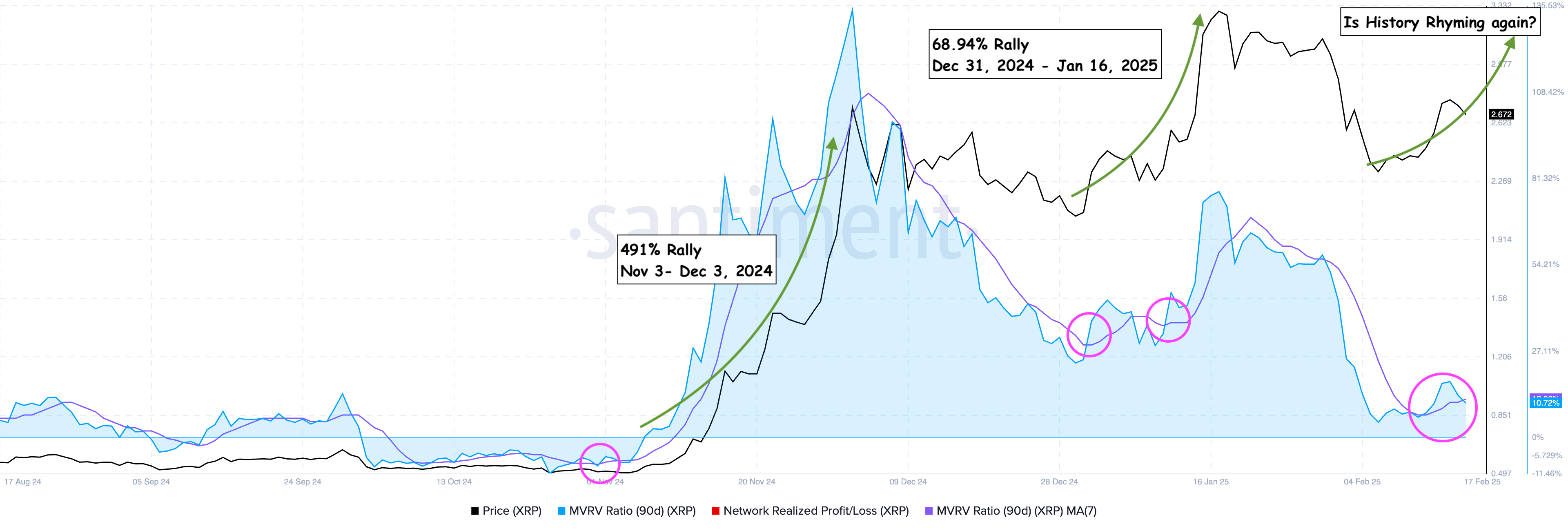 The recent movement of XRP suggests that a similar buy signal has appeared again, aligning with past trends. Analysts note that previous occurrences of this indicator have corresponded with sharp price increases. The latest MVRV ratio trend, combined with network realized profit and loss data, suggests that the market may be positioning itself for another breakout.