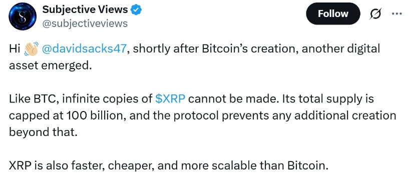 XRP has a capped supply of 100 billion, making it scarce, and it offers faster, cheaper, and more scalable transactions than Bitcoin. Source: Subjective Views via X