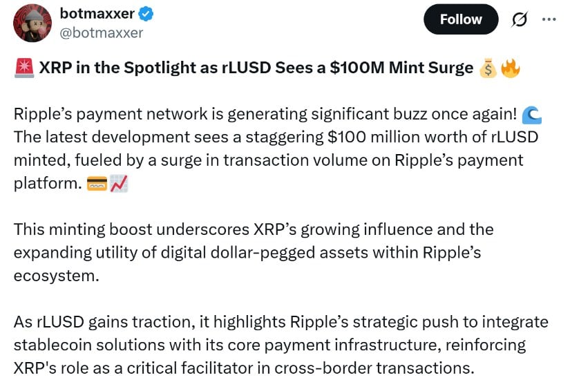 Ripple’s payment network is making waves again with $100 million in RLUSD minted amid soaring transaction volume. Source: Botmaxxer via X