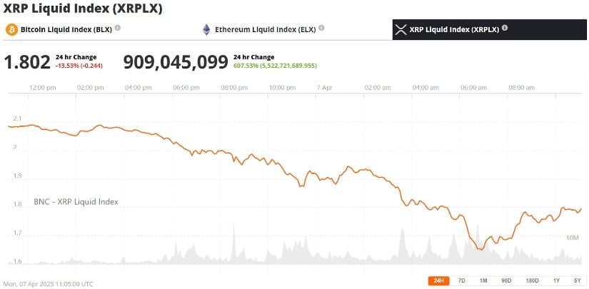 Ripple (XRP) was trading at around $1.80, down 13.53% in the last 24 hours at press time. Source: XRP Liquid Index (XRPLX) via Brave New Coin