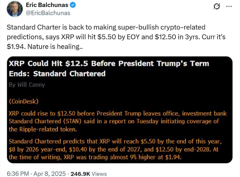 Standard Chartered is back with bold crypto predictions, forecasting XRP to hit $5.50 by year-end and soar to $12.50 by 2028 from its current $1.94. Source: Eric Balchunas via X