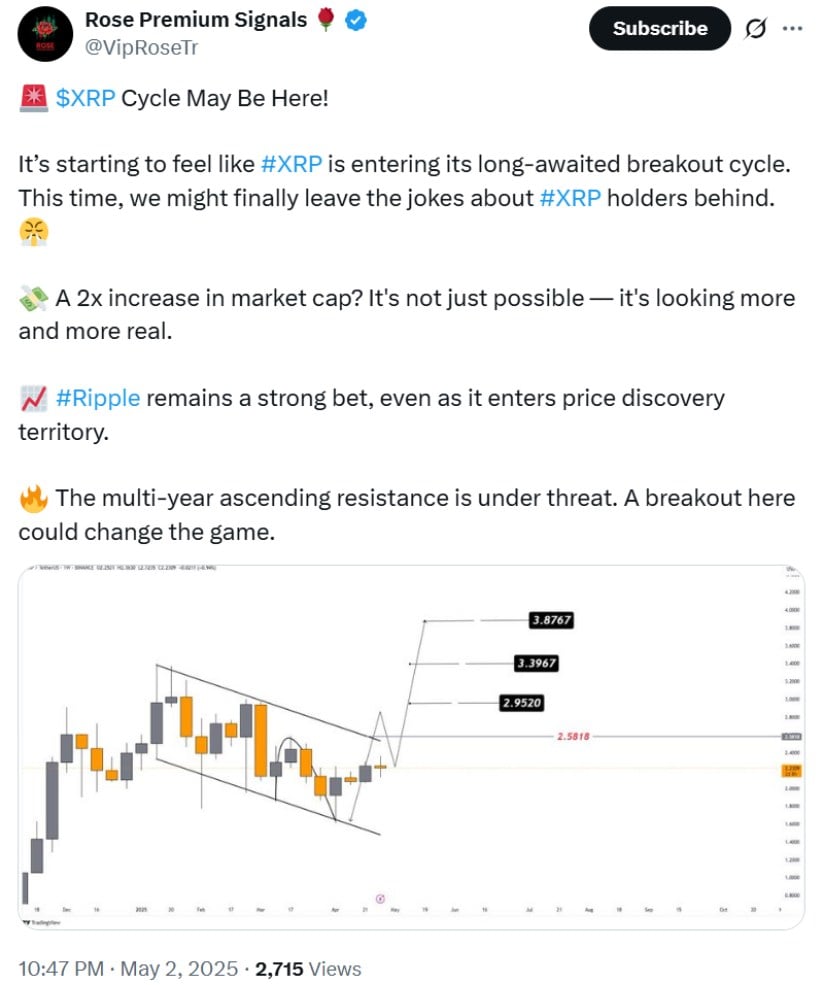 Prominent analyst VipRoseTr noted that XRP is approaching the end of a descending trendline, with higher highs suggesting that a breakout to $3.87 could be imminent. “This is the beginning of a long-anticipated cycle,” she said, forecasting a potential doubling in XRP’s market cap if resistance at $2.58 is broken convincingly.