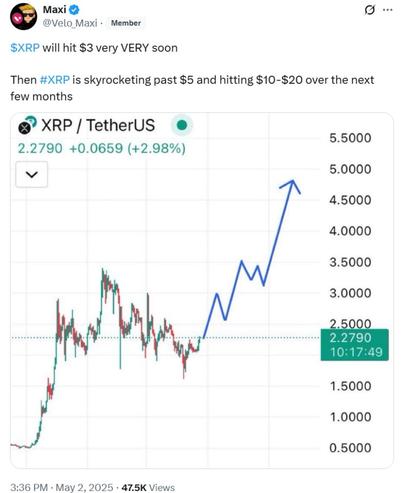XRP is expected to reach $3 soon, with projections pointing toward a potential surge to $5 and beyond in the coming months. Source: Maxi via X