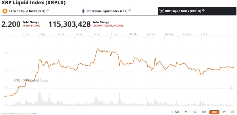The XRP price was holding the $2.20 support at press time. Source: Source: XRP Liquid Index (XRPLX) via Brave New Coin
