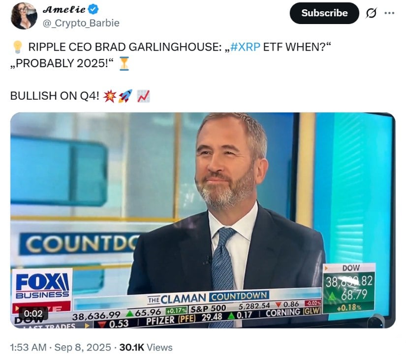 Ripple CEO Brad Garlinghouse hinted that an XRP ETF could arrive in 2025, expressing optimism for a strong Q4. Source: Amelie via X
