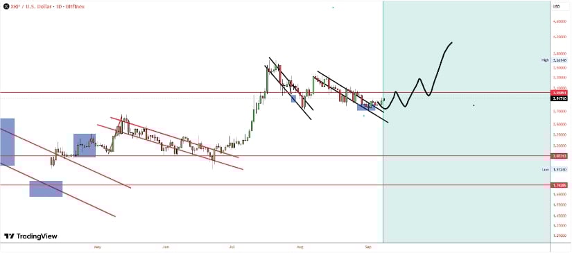 September 7 is now seen as a potential turning point, signaling the end of a prolonged consolidation phase and the start of a new upward trend. Technical charts indicate that XRP may be preparing for a push toward $3.33—and possibly its all-time high at $3.66 if momentum continues to build.