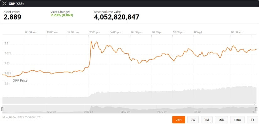 The XRP price today is hovering near $2.88, recovering from its early September lows of $2.70. According to market data, XRP has gained over 2% in the past 24 hours, outperforming the broader crypto market. This resilience has reignited bullish sentiment, especially as investors anticipate the next major leg higher.