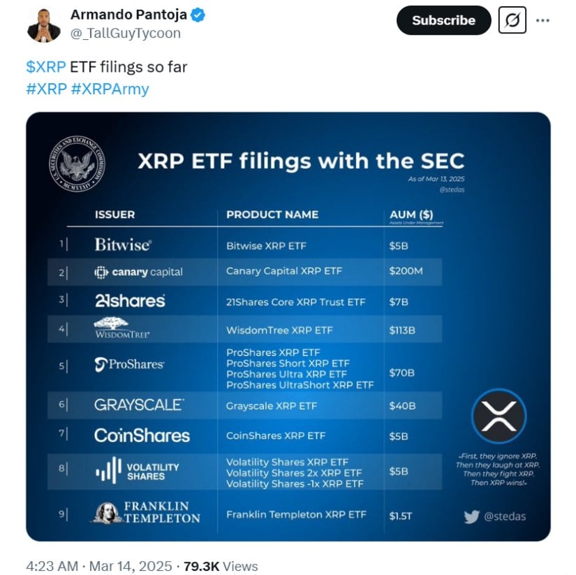 The list of companies that have applied for an XRP ETF so far. Source: Armando Pantoja via X