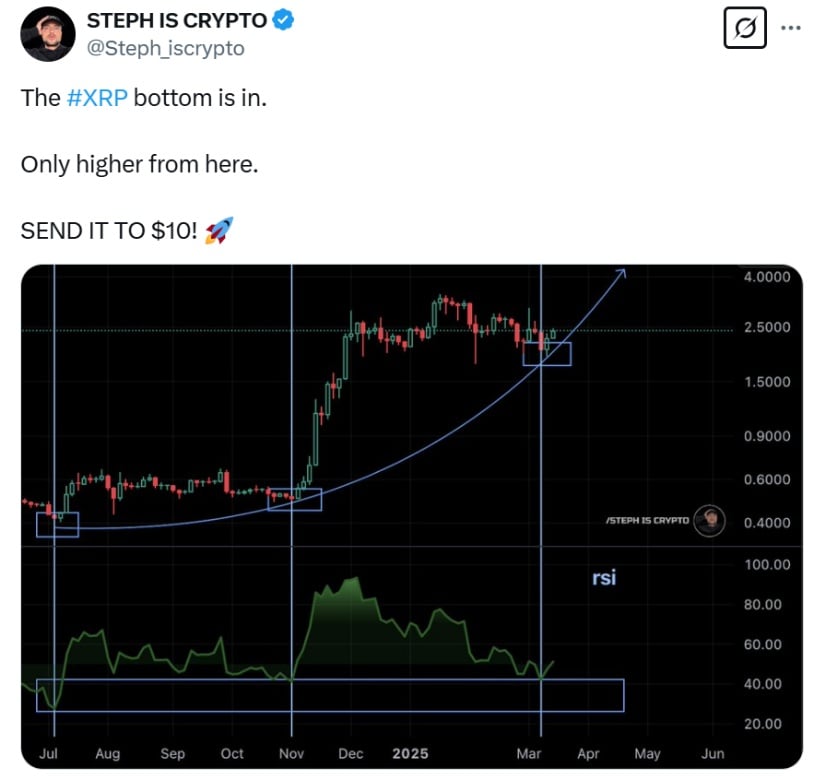 A market expert believes XRP has bottomed out and is set for a surge to $10. Source: Steph_iscrypto via X