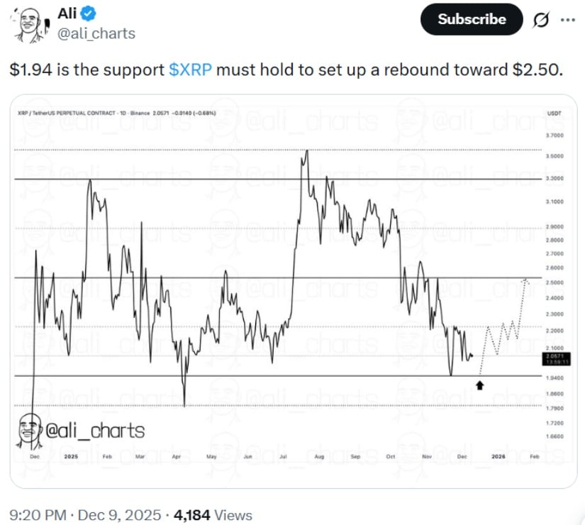 XRP must defend $1.94 support to potentially rebound toward $2.50. Source: @ali_charts via X