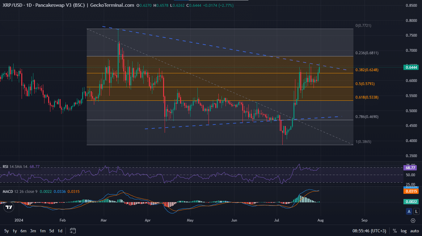 Traders looking to take long positions on the Ripple token, however, should consider waiting for the XRP price to break and close above the 23.6% Fibonacci retracement level of $0.6811. Elsewhere, renowned analyst @ali_charts on X says a bullish breakout could occur if the price breaches $0.90, after