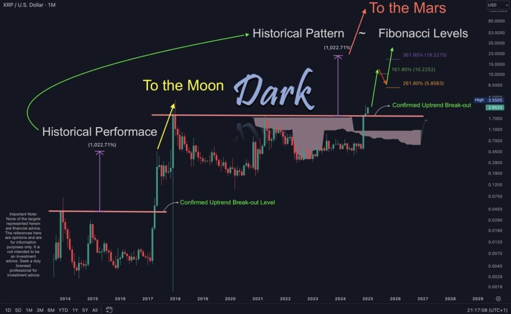 Chartist Dark Defender highlights a “confirmed uptrend breakout” on XRP’s monthly chart, drawing parallels to its 2017 bull market when it gained 1,022%. The analyst forecasts XRP prices could rise to $10.23 and even $18.23 in the near term, based on Fibonacci retracement levels from the 2017 rally. Whether XRP goes to the moon, or indeed, “to the mars”, both options are on the table in 2025.