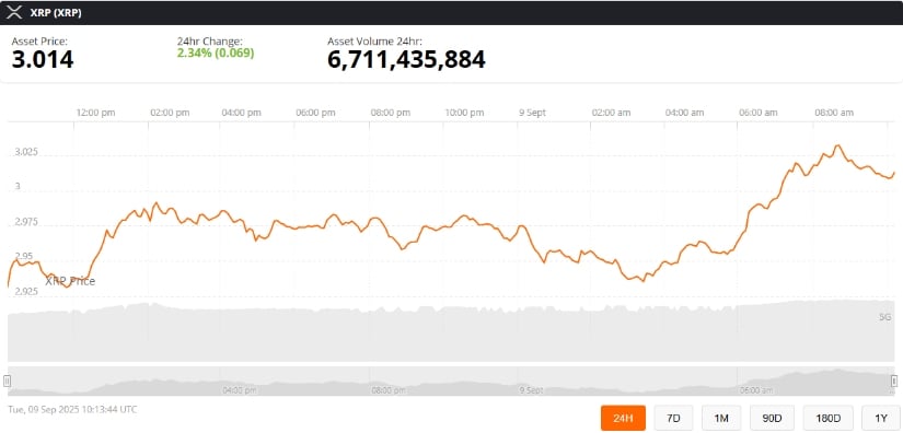 The current XRP price is hovering near $3.01, up over 2% in the past 24 hours, with intraday highs touching $3.02. This decisive move above the $3.00 barrier was fueled by strong buying pressure and more than $6 billion in 24-hour trading volume, signaling renewed investor participation.