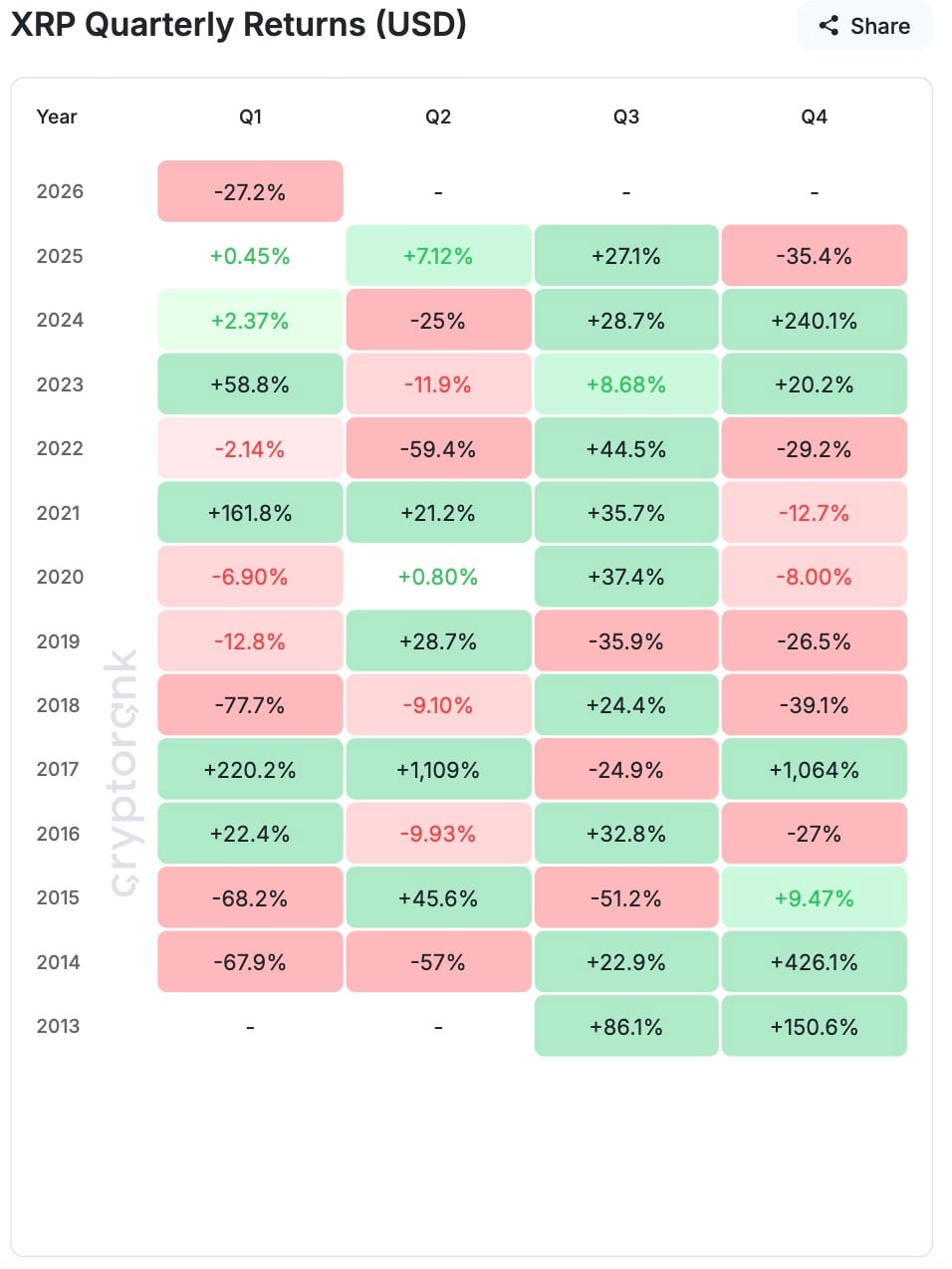 - XRP bottom? XRP closed Q1 with a -27.3% return, its weakest since 2018, despite being officially classified as a digital commodity.