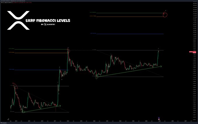 Historical price movements play a central role in the current analysis. During the 2017 rally, XRP respected Fibonacci levels, reaching the 2.414 extension before peaking.