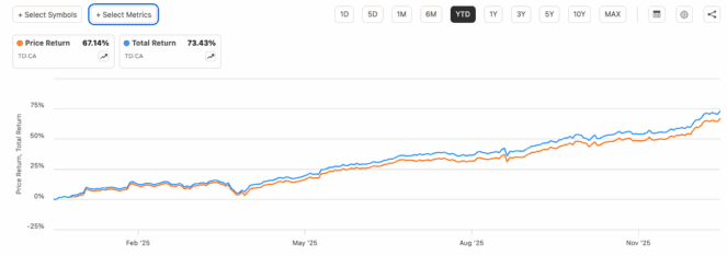 As you can see in the image below, TD stock has risen 67% in price so far this year. It has also delivered a 73% total return with dividends re-invested. The vast majority of the year’s return was from capital gains, not dividends. And since TD’s buyback was more than 10% of the beginning-of-year market cap, said buyback was probably a big influence on the capital gain.