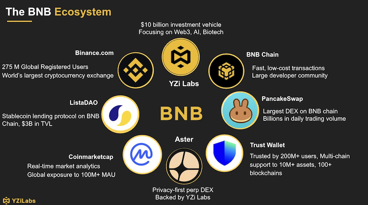 “BNB ecosystem represents the next phase of digital infrastructure, where decentralization, on-chain scalability converges with security and real distribution,” YZi Labs head Ella Zhang said.