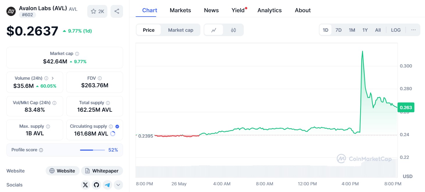 The investment announcement ignited a vertical rally in the AVL token, which surged by over 30% to reach a one-month high, pushing prices briefly past the $0.31 mark before stabilising near $0.27 at press time.