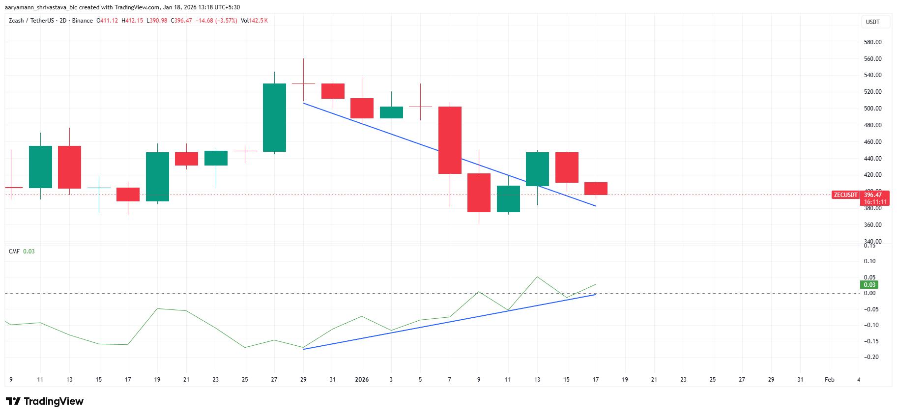Market sentiment around Zcash is improving as technical indicators flash early bullish signals. The Chaikin Money Flow indicator is forming a bullish divergence on the charts. While the ZEC price has continued to post lower lows, the CMF has produced a lower high, signaling hidden accumulation.