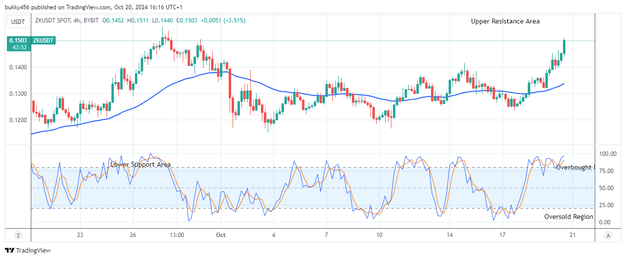 Amidst the recent market fluctuations, ZKUSD’s price maintains its bullish race as it expands and increases toward the upper resistance channel, fueling renewed investors’ excitement. Based on the stage structure, the coin buyers are prepared to drive a prolonged rally; if the coin holders demonstrate greater strength and the price sustains above the previous high value of $0.155, subsequent upward swings could take it to a high of $0.160 and beyond, sparking renewed interest and excitement in the ZKsync community.