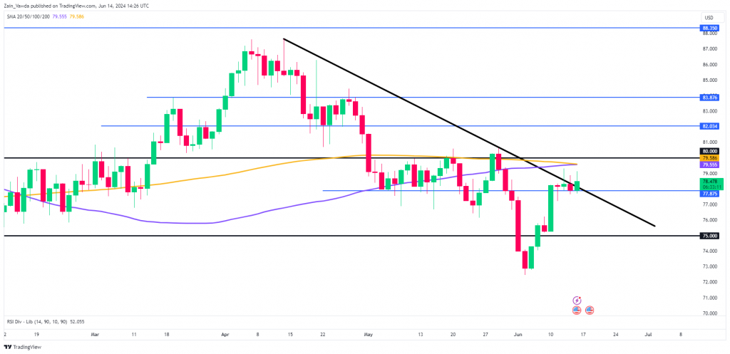 - WTI eyeing trendline break and psychological $80 a barrel mark.